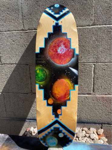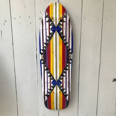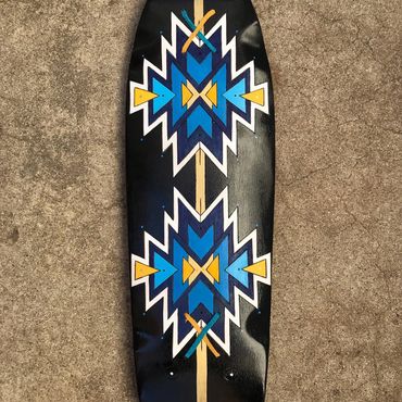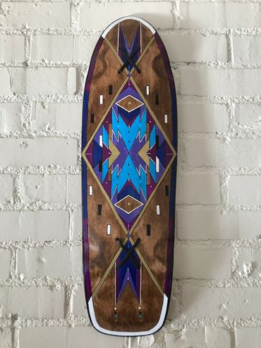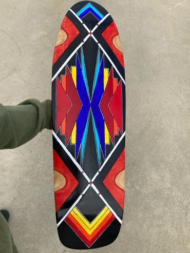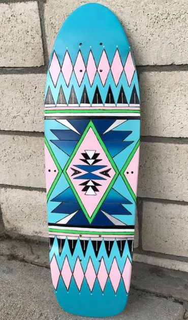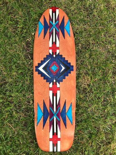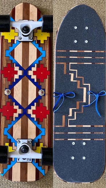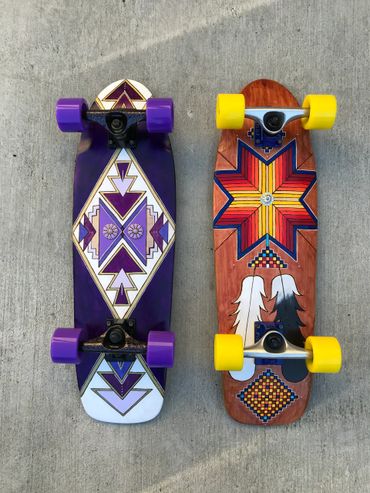 Di’Orr Greenwood of Arizona who represents her Navajo culture with a turquoise-inlaid skateboard that features eagle feathers and colors of the rising or setting sun . Greenwood’s inlaid Turquoise technique is found here.